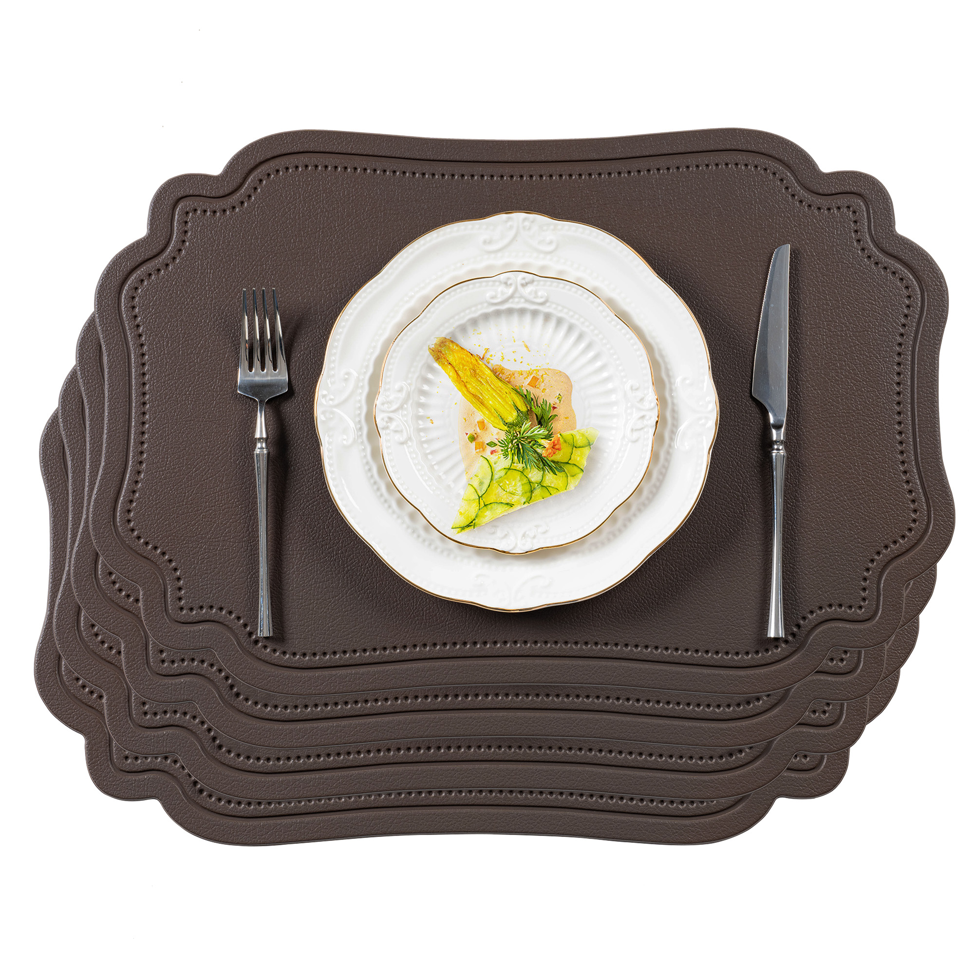 These high-quality leather placemats offer the sophisticated look of leather with easy-care practicality. The durable, wipe-clean surface resists daily wear while maintaining elegant appearance for any dining occasion. The non-porous surface prevents absorption, allowing effortless cleanup with just a damp cloth after meals - perfect for busy households. Thermal barrier design safeguards your table from hot dishes up to specified temperatures. Generous 18"x12" dimensions (45x30cm) accommodate full place settings. The 0.08" thickness (2mm) provides ideal protection. Neutral color options complement all tableware styles. Matching placemat collection creates cohesive table settings. Perfect for everyday family meals or entertaining guests, offering both functionality and elevated dining presentation.